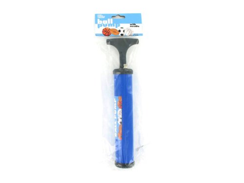 This plastic and steel pump is perfect for inflating soccer balls, footballs, basketballs and volleyballs. Comes with inflating needle. The blue shaft has a sports ball decal. Item comes in a poly bag with header card and UPC. Total length 9 3/4" with 1 1/2" diameter shaft and handle width 2 3/8". Needle shaft length is 1 3/16".
