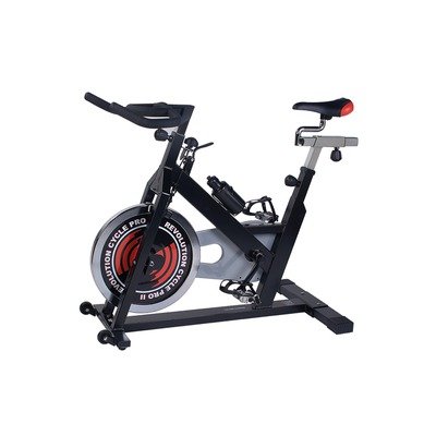 The modern-looking Revolution Cycle Pro II has advanced features such as � Direct Drive Resistance System, Emergency Stop Brake System, Adjustable Seats/Handlebars, and Easy Transportation. This revolutionary product is designed for an energetic and challenging workout, and is also adapted to people with different intensity needs. Unlike road bikes, the flywheel does not continue to spin if the rider stops pedaling. The rider slows the flywheel and controls the tension with a tension knob. A two-way adjustable seat post allows for a more complete and versatile exercise routine. This seat system was specifically designed for easy movement horizontally and vertically while mounted on the bike during the workout. Adjustable forward positioned handlebars and racing style pedals give the Revolution Cycle Pro II a road bike feel.